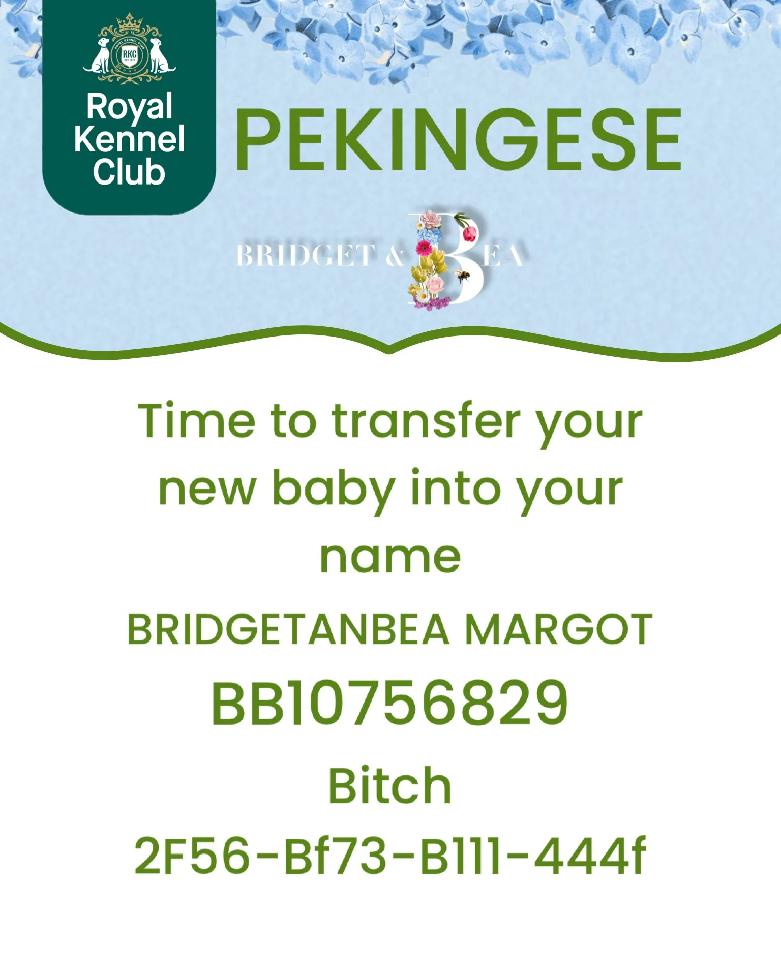 HERE YOU WILL FIND INFORMATION ON HOW TO TRANSFER OWNERSHIP WITH THE KENNEL CLUB INTO YOUR NAME.