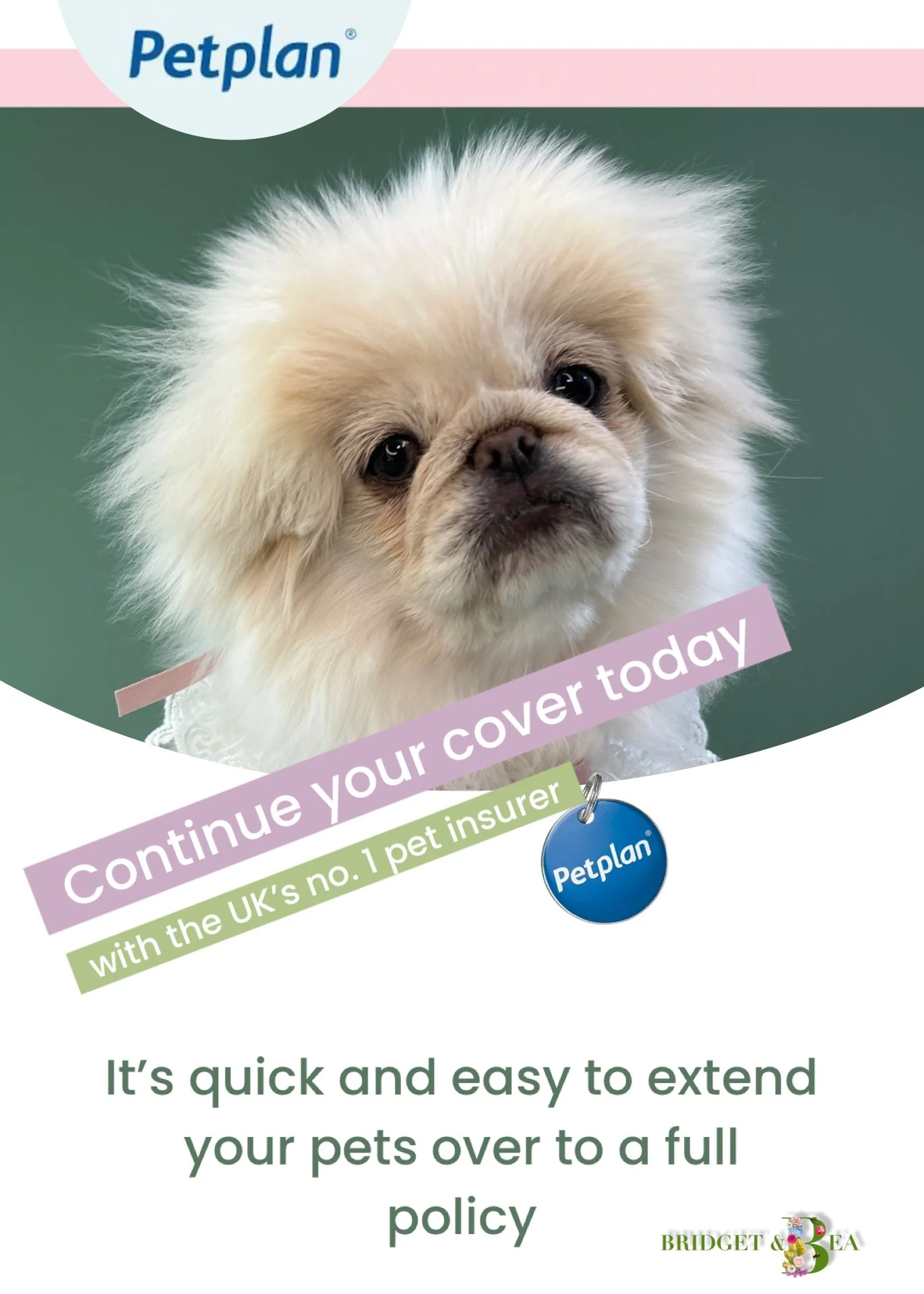 4 WEEKS FREE INSURANCE YOUR 4 WEEKS FREE INSURANCECONGRATULATIONS ON YOUR NEW BRIDGET & BEA PUPPY.ALL OUR PUPPIES COME WITH 4 WEEK FREE PETPLAN INSURANCE.YOU WILL FIND YOUR UNIQUE ACTIVATION CODE IN YOUR PUPPY FILE.CLICK HERE TO BE DIRECTED STRAIGHT TO PET PLAN TO CONTINUE YOUR COVER AND PROTECT YOUR PUP. WHY CONTINUE YOUR COVER WITH PETPLAN? call Petplan